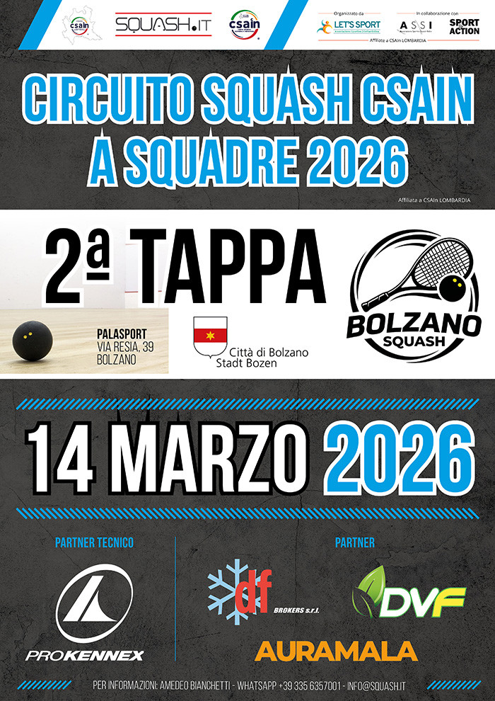 Sabato 14 marzo, sui 6 campi del “Bolzano Squash” nel Palasport di Via Resia, ritorna lo squash con la 2ª Tappa del Circuito Nazionale a Squadre CSAIn. Si tratta di un grande ritorno dopo tanti anni nel bellissimo impianto sportivo della città di Bolzano e sede organizzativa di eventi di caratura nazionale ed internazionale.
