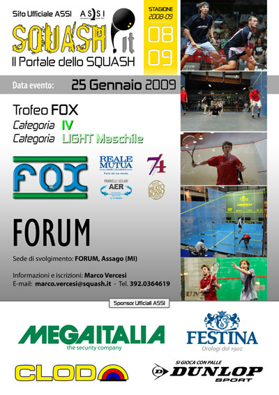 Trofeo FOX di IV Categoria: tabellone online! Grande evento in programma al Forum di Assago per domenica 25 con in campo più di 40 giocatori per il Trofeo FOX di categoria IV e LIGHT maschile. E' disponibile il tabellone da 32 giocatori del torneo di IV categoria con inizio qualifiche alle ore 10.15 e tabellone principale ore 10.45. Inizio categoria LIGHT previsto per le ore 13.00. Importante per tutti i giocatori: parcheggio dedicato "S". Ricco montepremi con premiazione dei finalisti di tutte le posizioni.Commenti dei giocatori